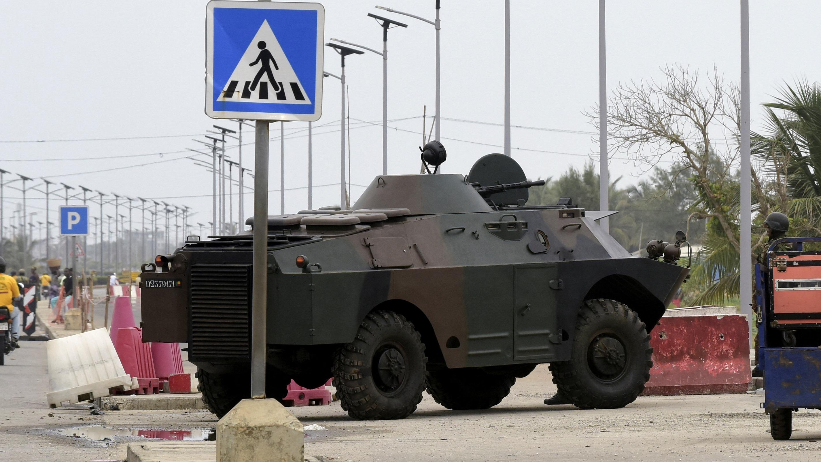 Un véhicule militaire blindé, un jour après que les forces armées du pays ont déjoué la tentative de coup d’État contre le gouvernement du président Patrice Talon, à Cotonou, Bénin, le 8 décembre 2025.