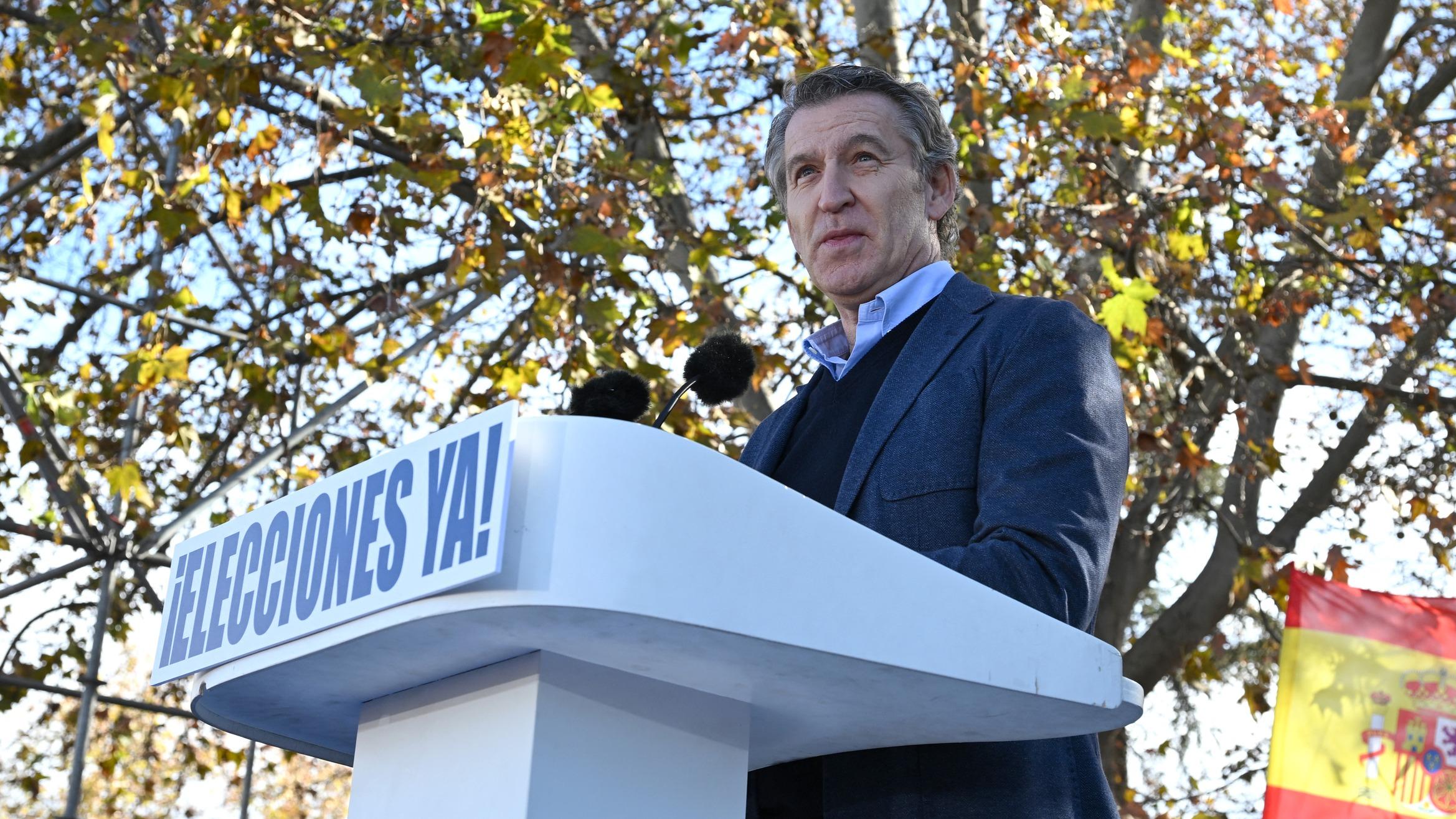Le chef du Parti populaire (PP), formation d’opposition de droite en Espagne, Alberto Núñez Feijóo, prononce un discours lors d’une manifestation contre la corruption organisée par le PP à Madrid, le 30 novembre 2025.