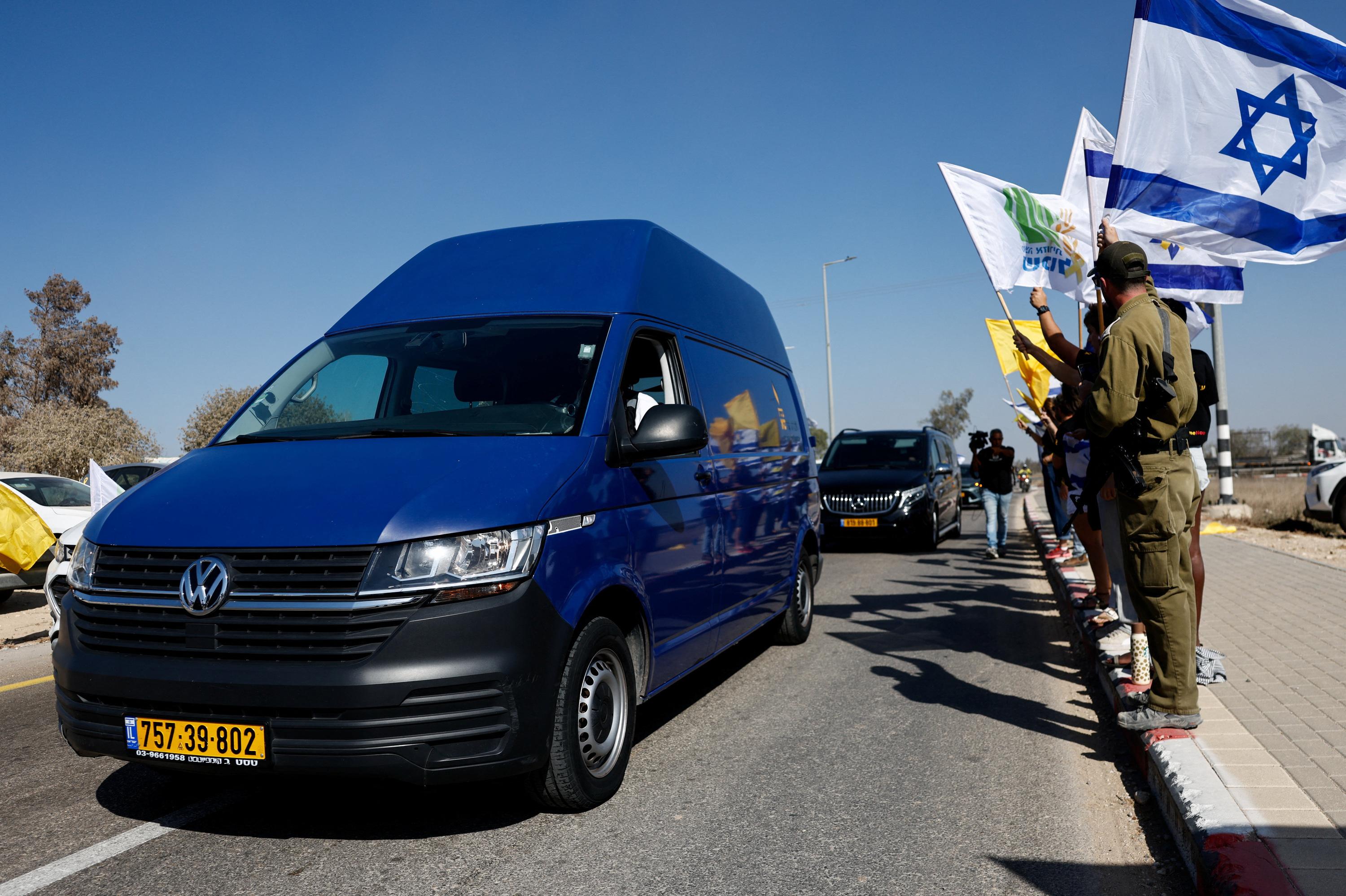 Des drapeaux sont agités alors qu’un véhicule transporte le corps de l’otage israélien Yossi Sharabi, lors de son cortège funèbre au Kiboutz Beeri en Israël, le 27 octobre 2025.