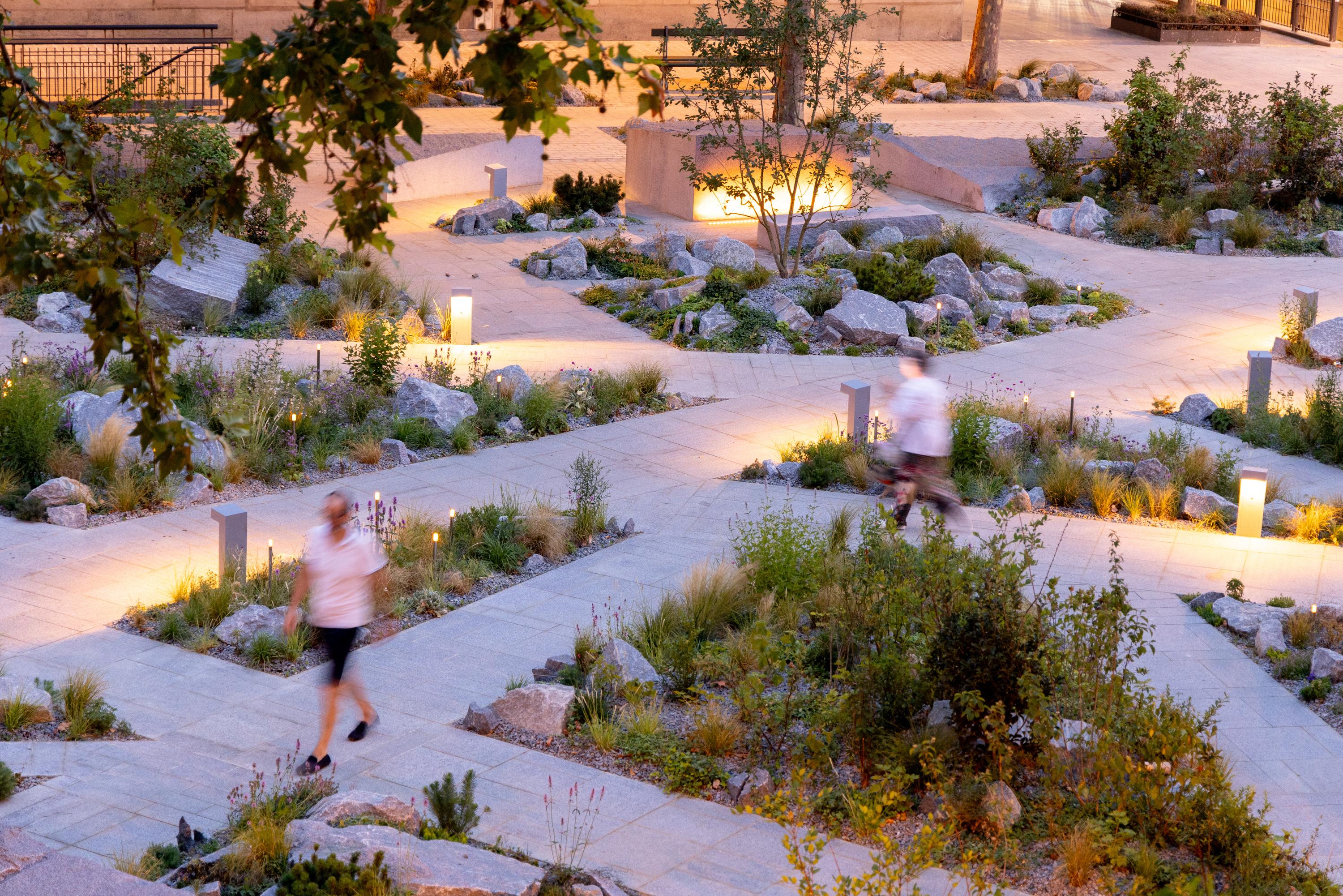 Un parterre de pavés et de végétation surplombé de stèles de granit et entouré d’arbres feuillus compose le jardin.