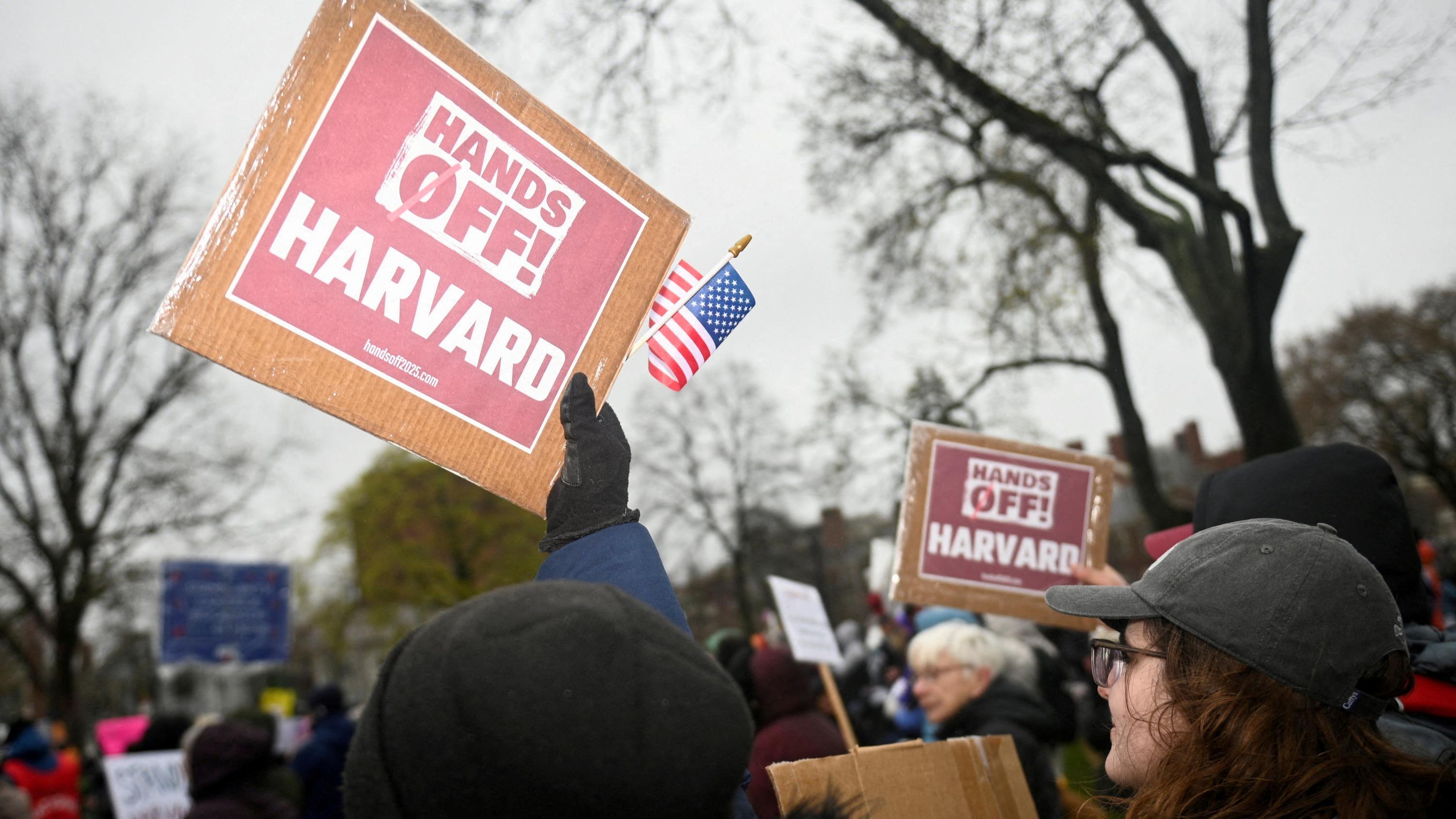Des manifestants américains lors d’une manifestation organisée par la ville de Cambridge où est située Harvard appelant la direction de l’université à résister à l’ingérence du gouvernement fédéral le 12 avril 2025.