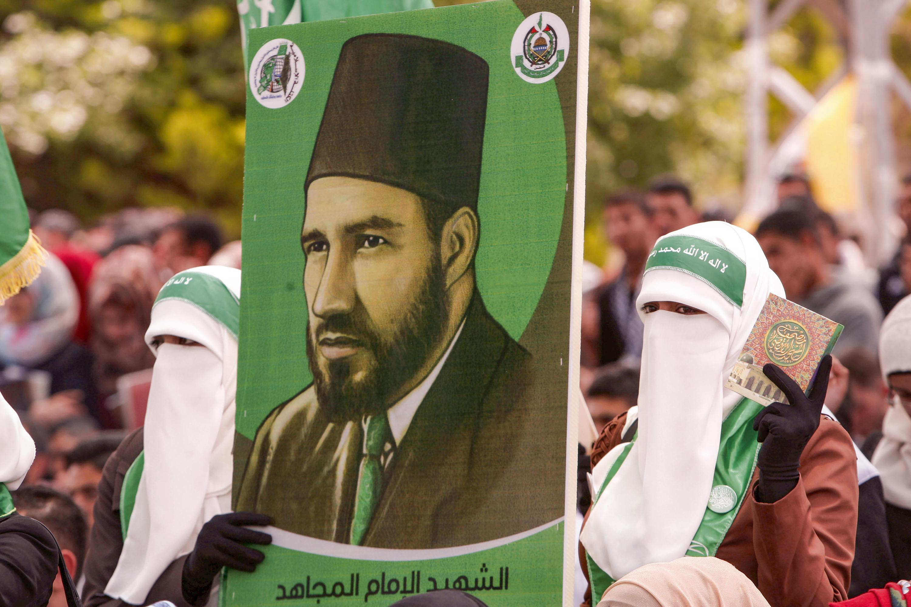 Des étudiants palestiniens soutenant le Hamas brandissent le portrait de Hassan al-Banna, fondateur des Frères musulmans, durant une campagne électorale pour le conseil de l’Université polytechnique palestinienne de Hébron, en 2015.