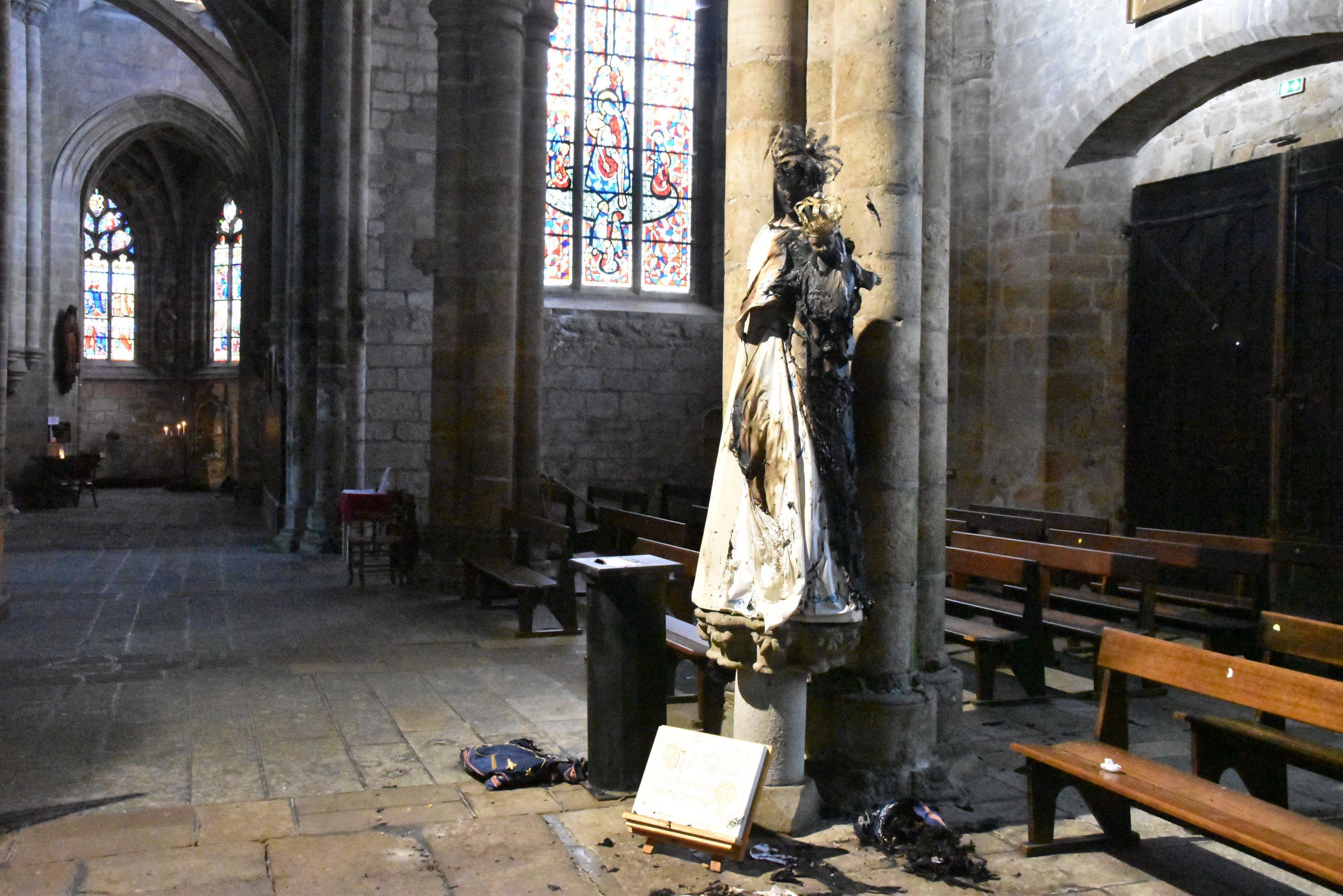 Le 8 septembre 2025, la statue de la Vierge, dans la basilique de Guingamp (22), a été la cible d’un incendie alors que se déroulait une messe dans l’édifice religieux.