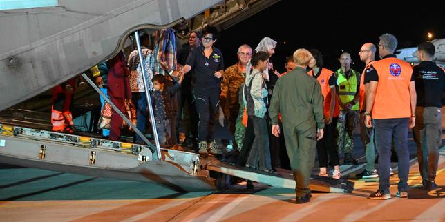 Des enfants palestiniens et leurs familles dans le cadre d’une évacuation médicale par un avion militaire italien, le 14 août 2025, à l’aéroport de Rome.
