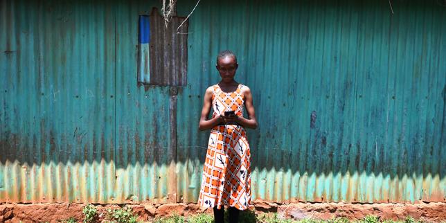 Imelda Mumbi, 13 ans, utilise son smartphone pour suivre des cours en ligne grâce à une application, à Nairobi, le 8 novembre 2018.