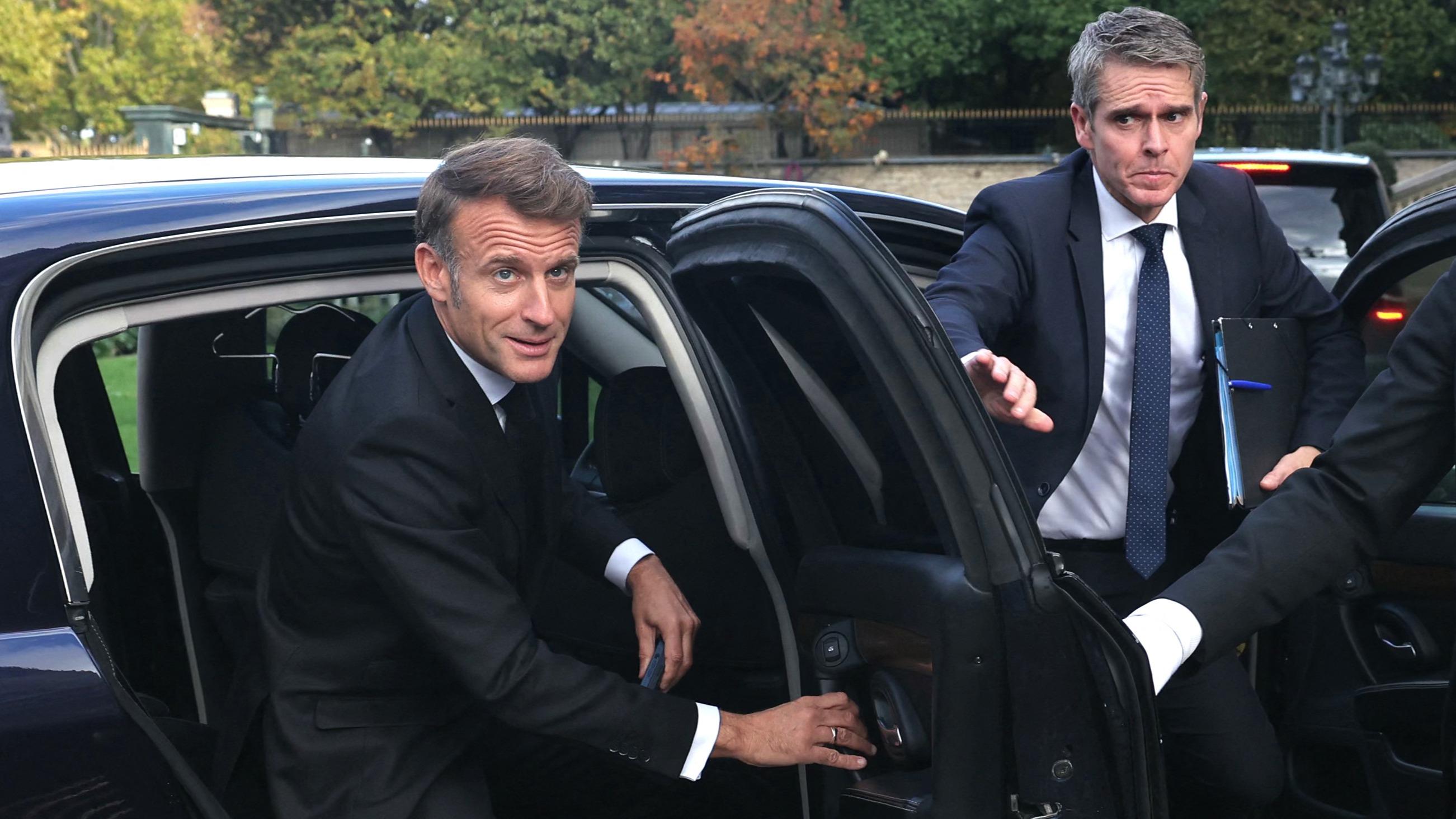 Emmanuel Macron arrive au Quai d’Orsay, ce jeudi.