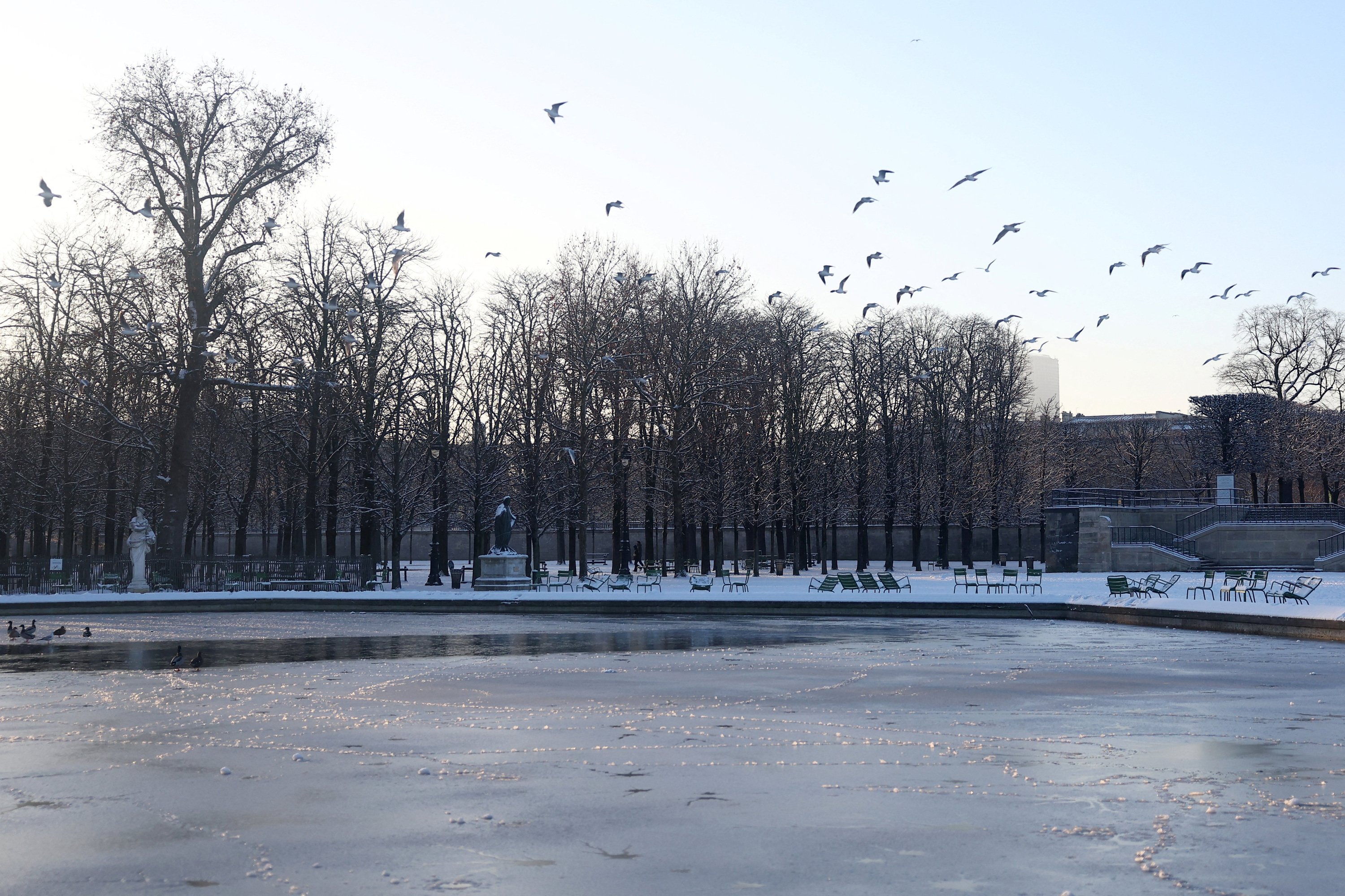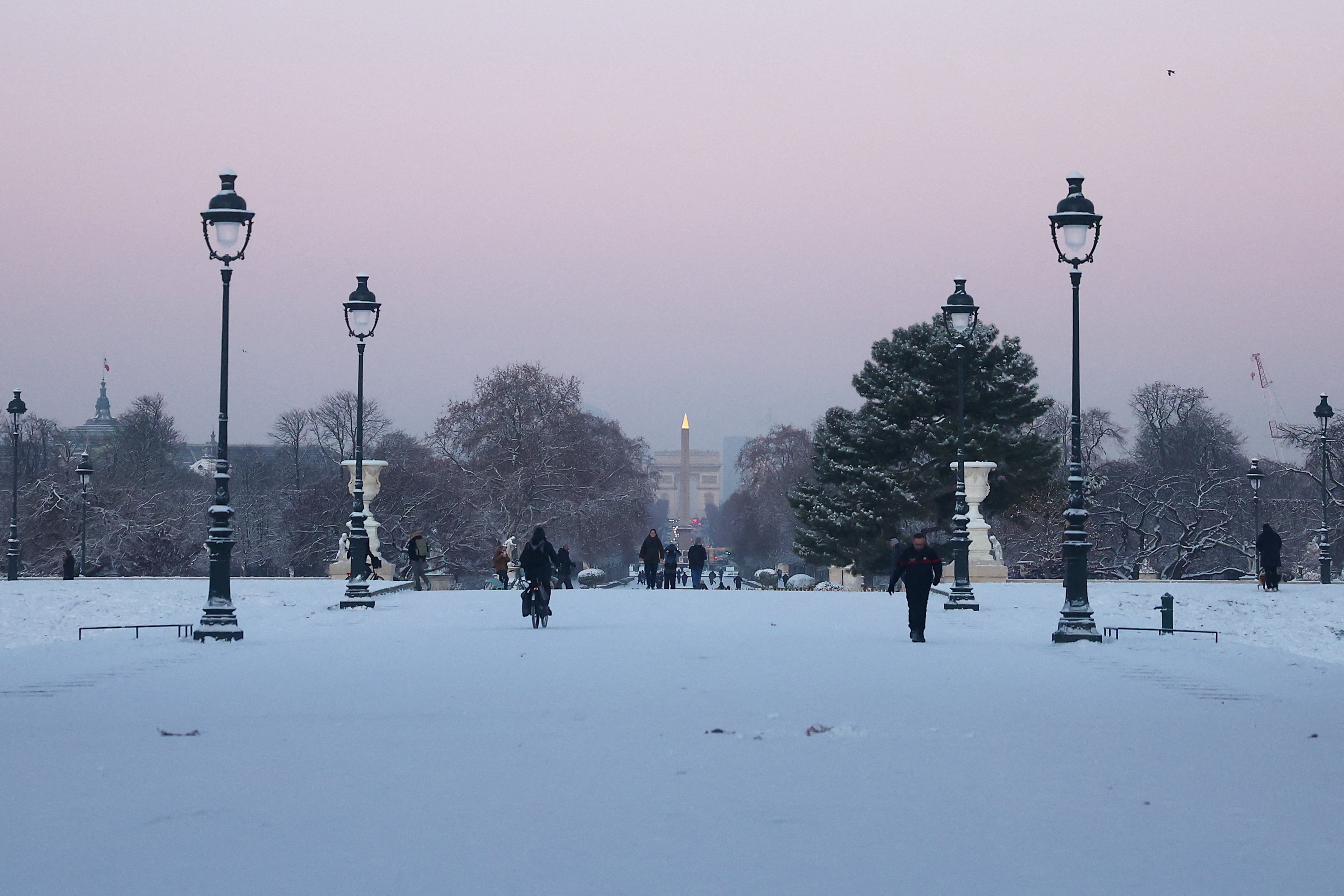Vue du jardin des Tuileries enneigé à Paris alors qu’un temps hivernal avec de la neige et des températures froides touche une grande partie de la France, le 6 janvier 2026.
