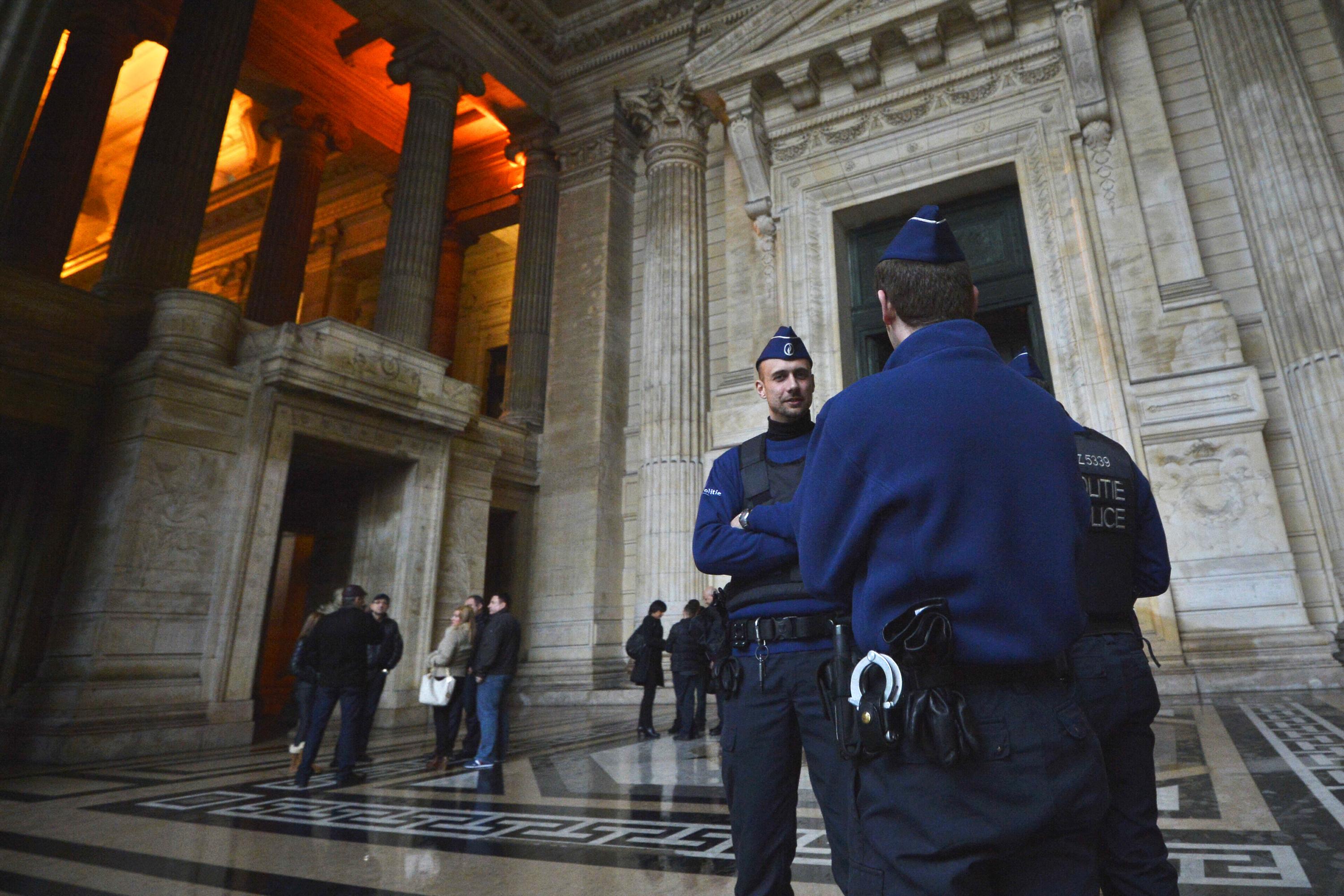 Des policiers se tiennent devant le palais de justice de Bruxelles avant la comparution du pédophile Marc Dutroux devant la cour d’exécution le 4 février 2013.