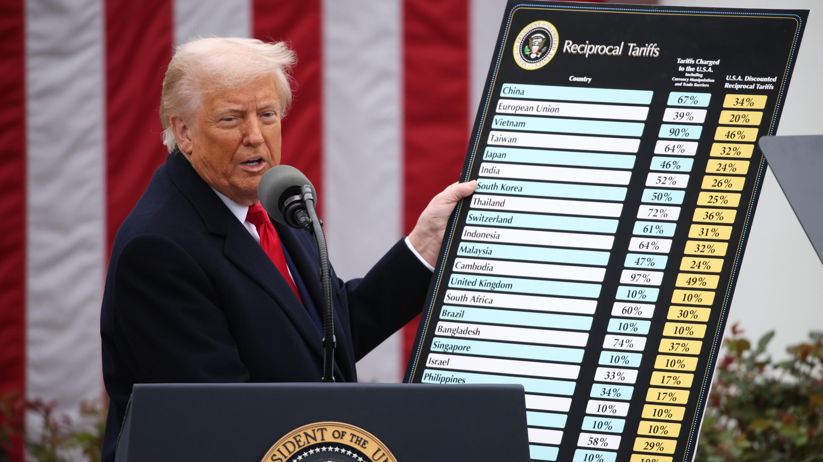 Donald Trump présente un tableau répertoriant les droits de douane réciproques, dans la Roseraie de la Maison-Blanche, le 2 avril 2025, le « jour de la libération » qu’il a orchestré.