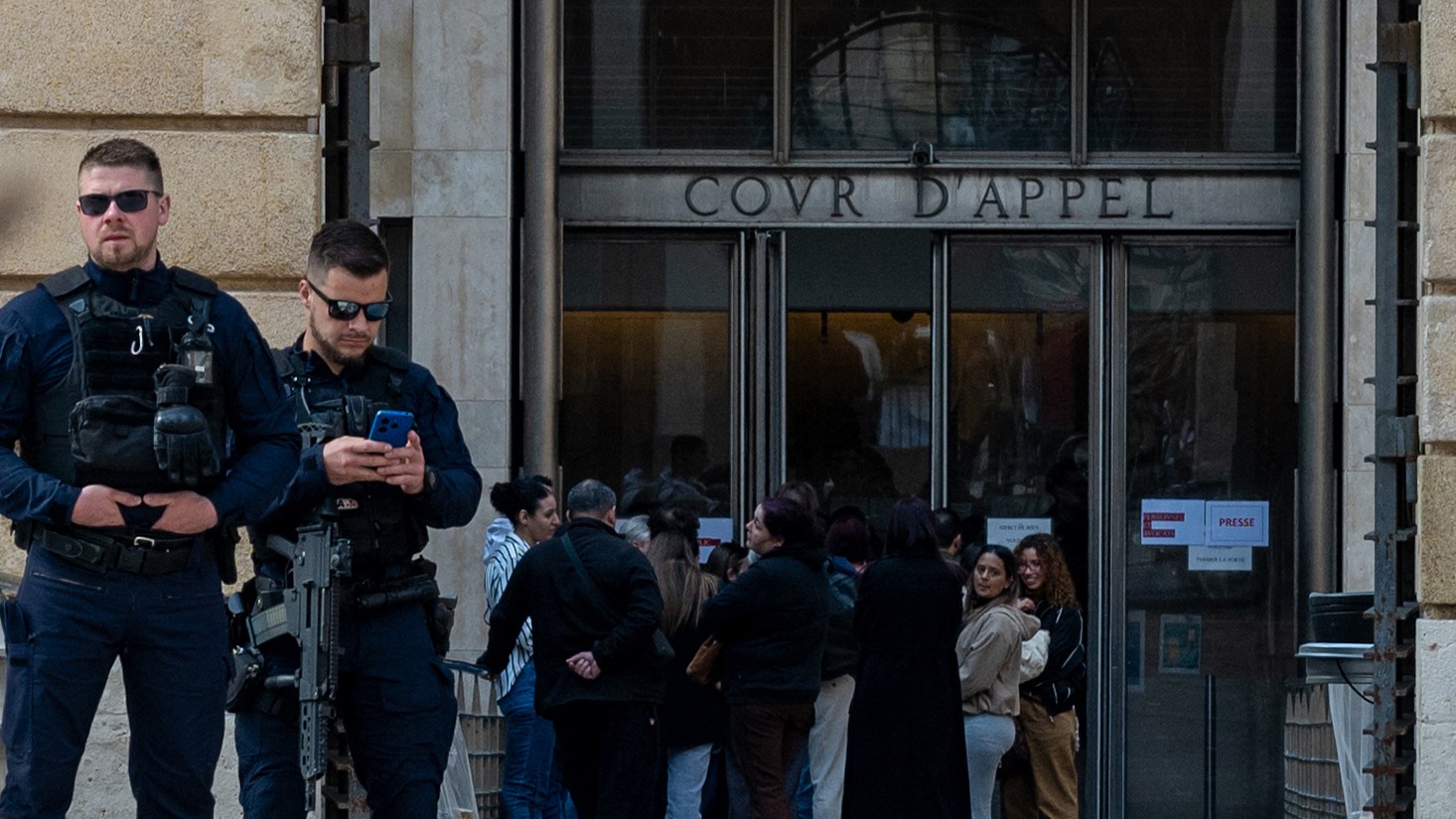 Des CRS montent la garde à l’entrée du palais de justice lors de la première journée du procès de membres présumés de la DZ Mafia à Aix-en-Provence, le 23 mars 2026.