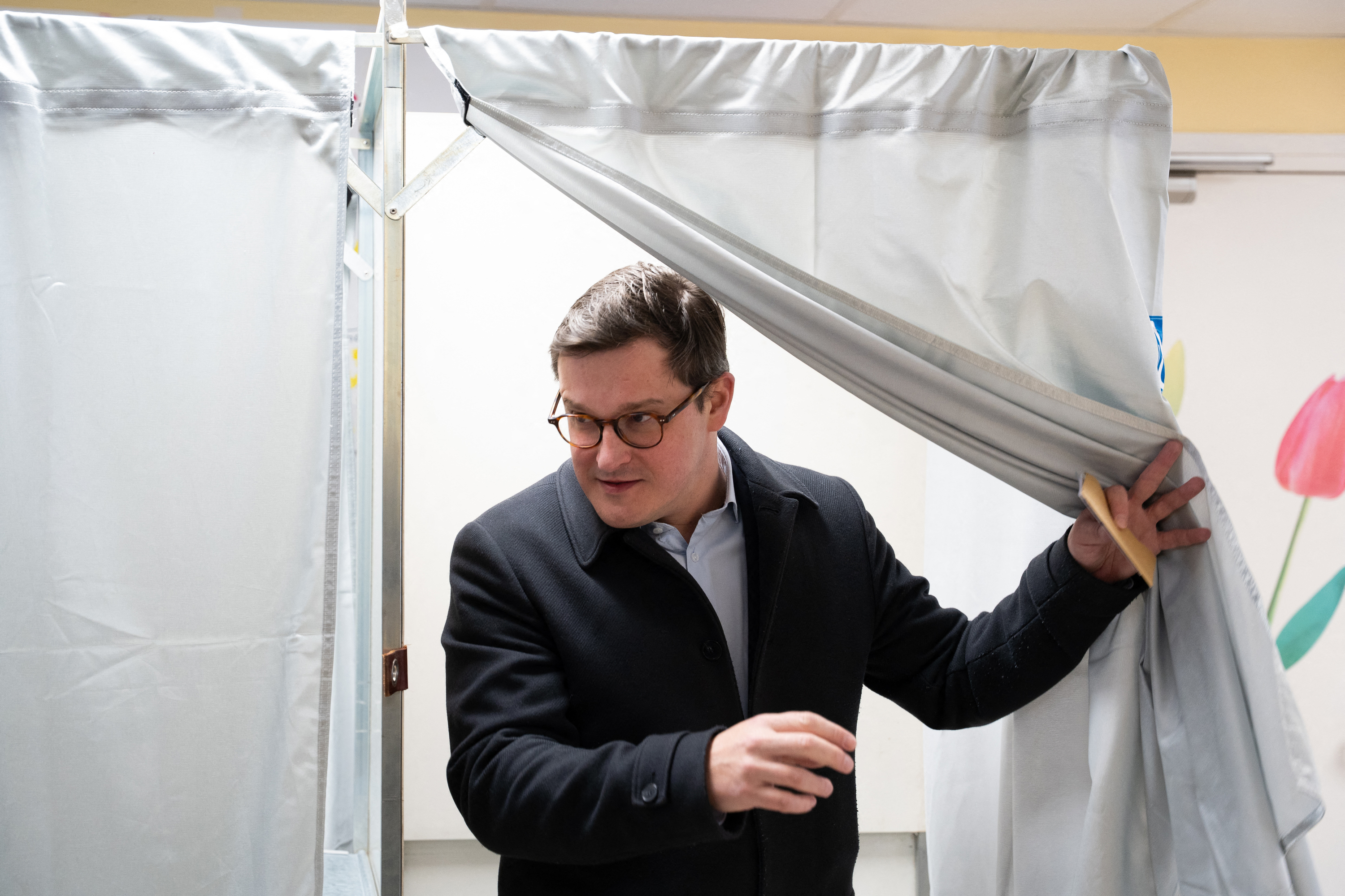Grégory Doucet, maire sortant de Lyon et candidat du parti Europe-Écologie Les Verts (EELV) à sa réélection, dans un bureau de vote de la capitale des Gaules ce dimanche.
