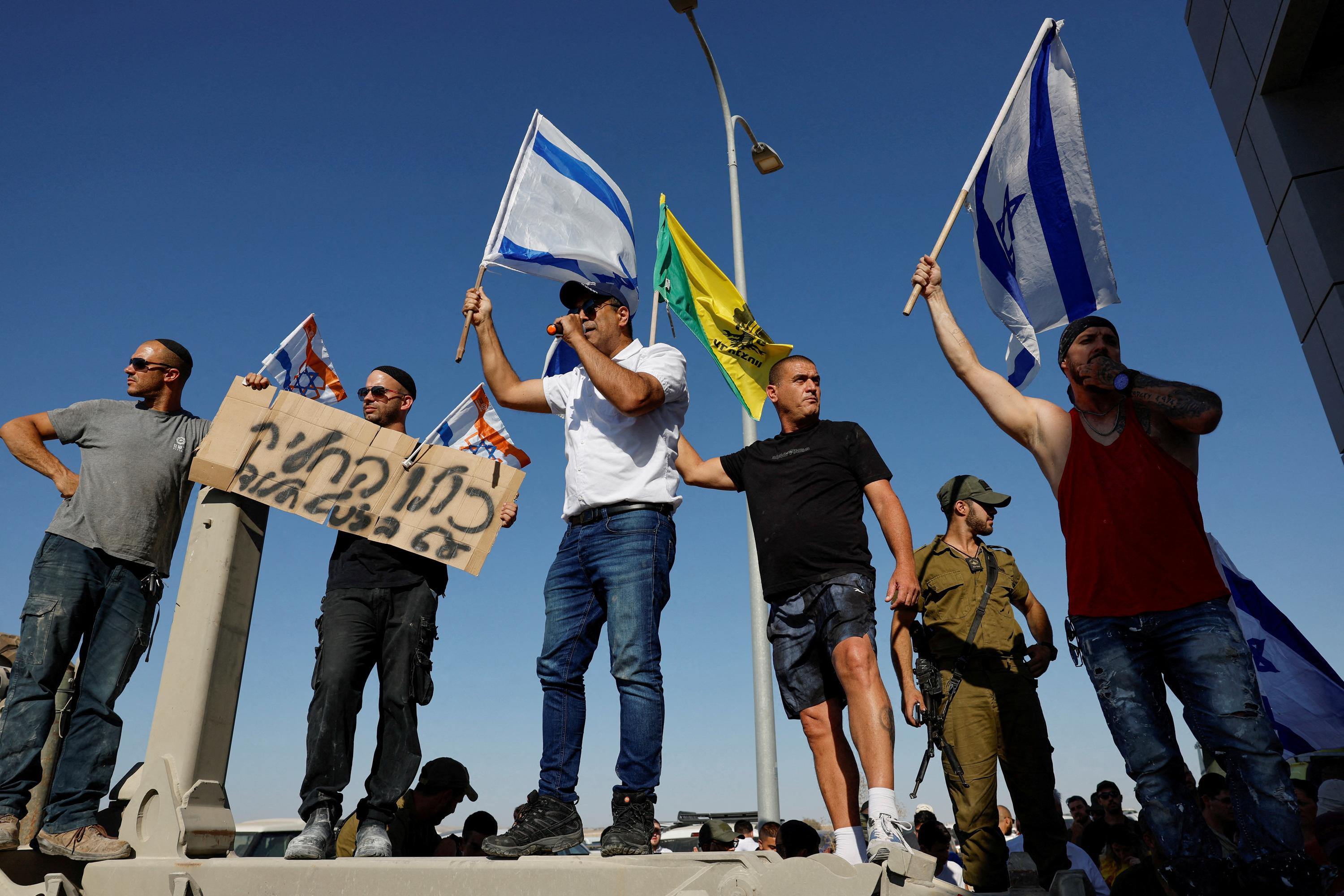 Des manifestants de Fujaira se rassemblent devant le centre de détention de Sde Teiman alors que la police militaire israélienne est arrivée sur place dans le cadre d’une enquête sur des soupçons de mauvais traitements infligés à un détenu palestinien, le 29 juillet 2024.
