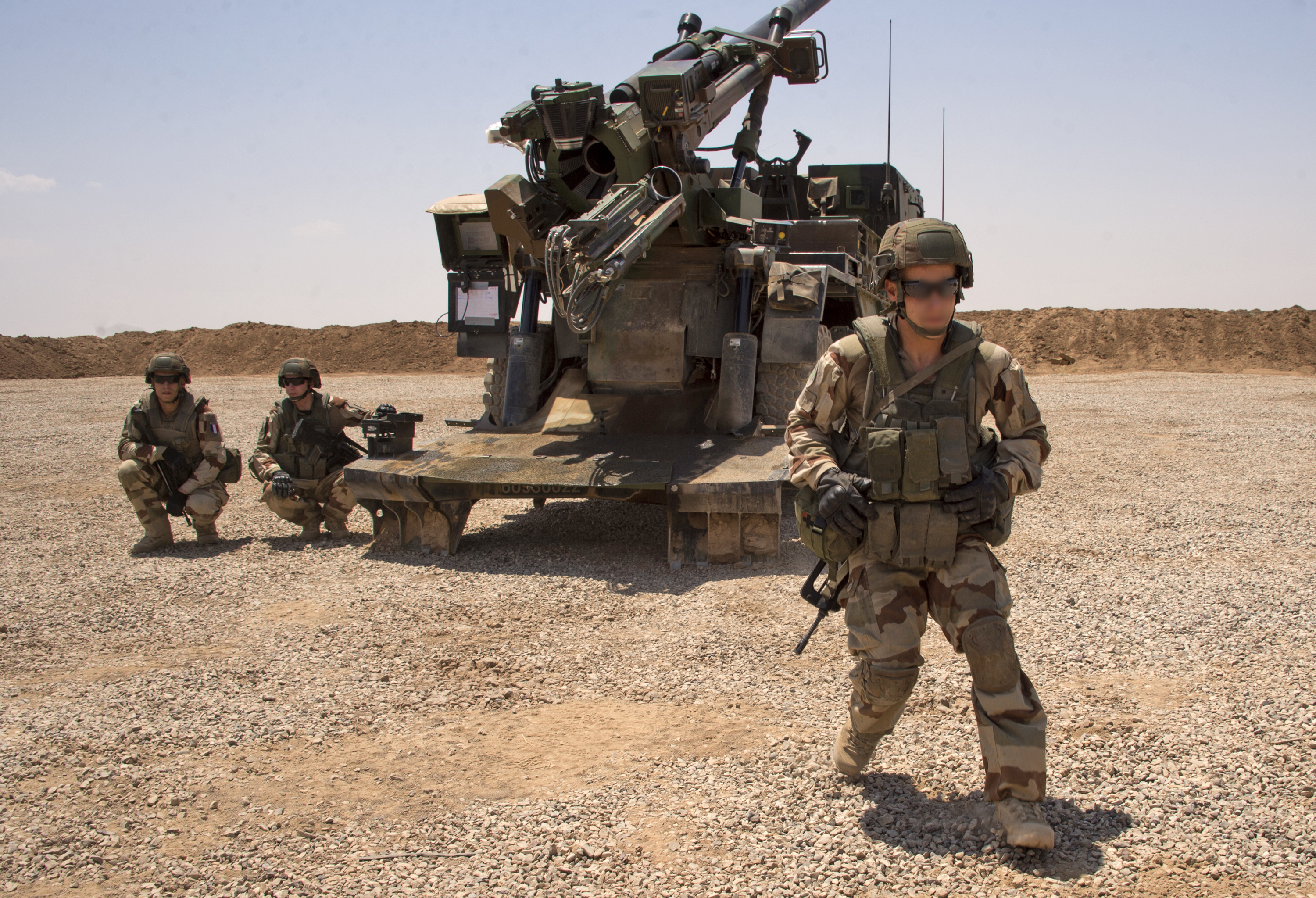 Des soldats français de la Task Force Wagram se tiennent à côté d’une unité de CAESAR, au nord de Mossoul, le 13 juillet 2017, alors que l’armée française apporte un soutien militaire aux forces irakiennes qui combattent le groupe État islamique.