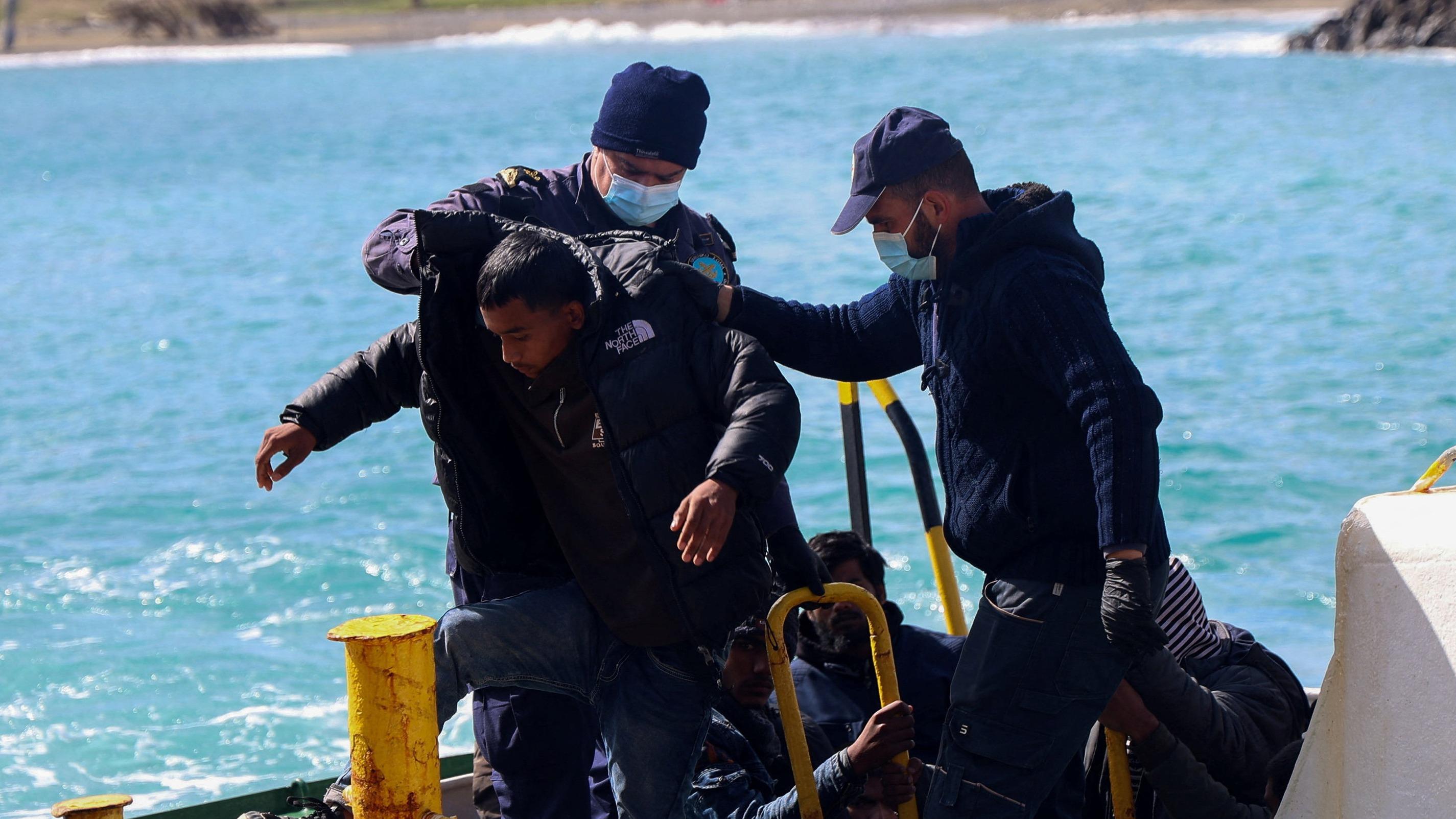 Des migrants débarquent d’un navire au port de Kaloi Limenes, sur l’île de Crète, en Grèce, le 21 février 2026.