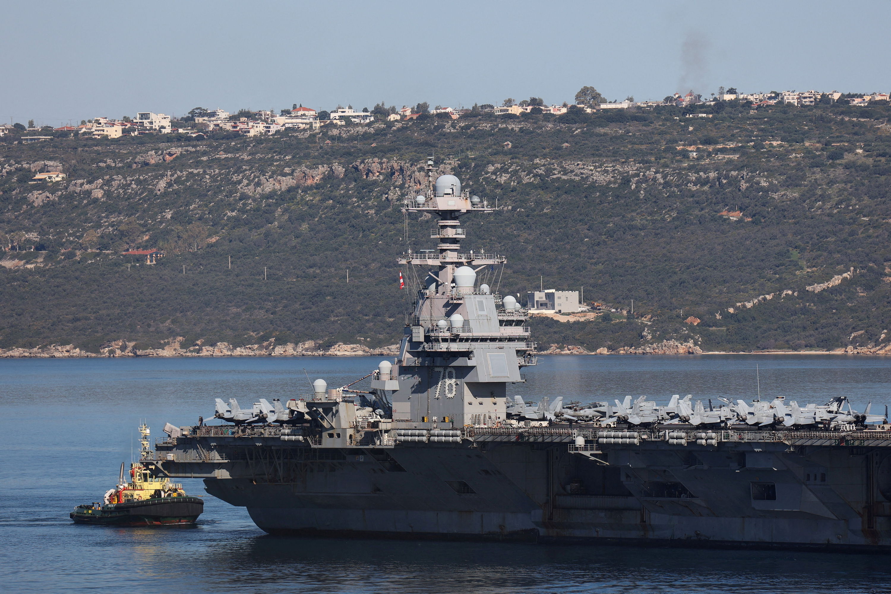 Le porte-avions USS Gerald R. Ford quitte la baie de Souda sur l’île de Crète.